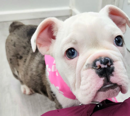 I am a female, blue merle and white, English Bulldog. My father weighs 52lbs and my mother weighs 47lbs. I am microchipped, registerable with the American Kennel Club, and come with a four generation pedigree. My breeder is USDA Licensed, State Licensed, and have been raising puppies for 10 years.