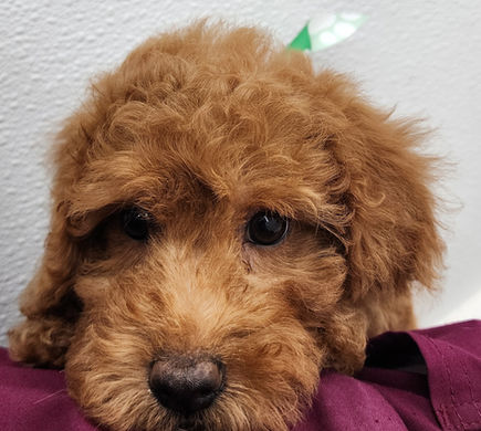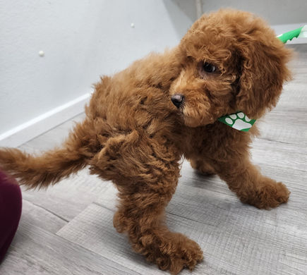 I am a male, red with white markings, Mini Goldendoodle (Mini Poodle/ Golden Retriever mix). My father is a Mini Poodle and weighs 13lbs with OFA Certificates on his hips, knees, heart, and eyes. My mother is a Mini Goldendoodle. I am microchipped, registerable with the International Canine Association, and come with a four generation pedigree. My breeder is USDA Licensed.