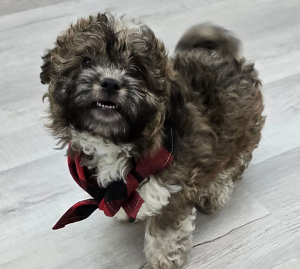 I am a male, brindle and white, Teddy Bear (Shih Tzu/ Bichon Frise mix). My father is a Shih Tzu and weighs 8.5lbs and my mother is a Bichon Frise and weighs 13lbs. I am microchipped, registerable with the United All Breed Registry, and come with a four generation pedigree. My breeder is USDA Licensed, State Licensed, and accredited with the AKC.